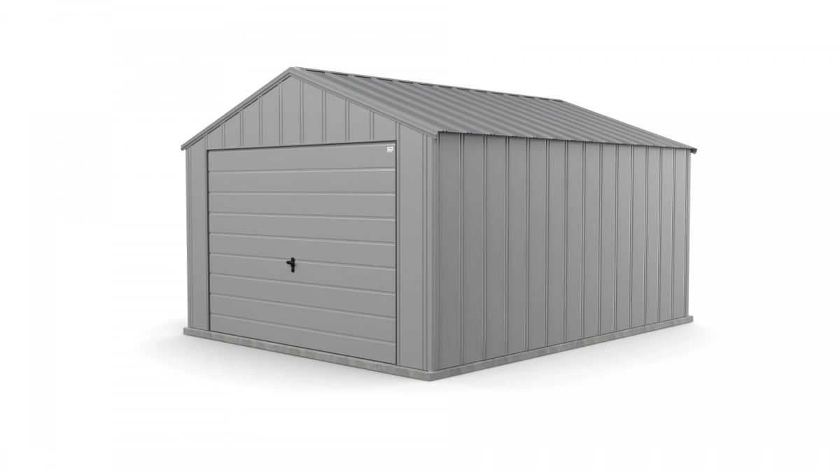 RETRO Blechgarage Duo-Falz, 4 m × 6 m, mit Schwingtor und Satteldach. Die Wand und Dacheindeckung besteht aus Acryl Duo-Falzblech, das Schwingtor aus Acryl-Trapezblech T-17.