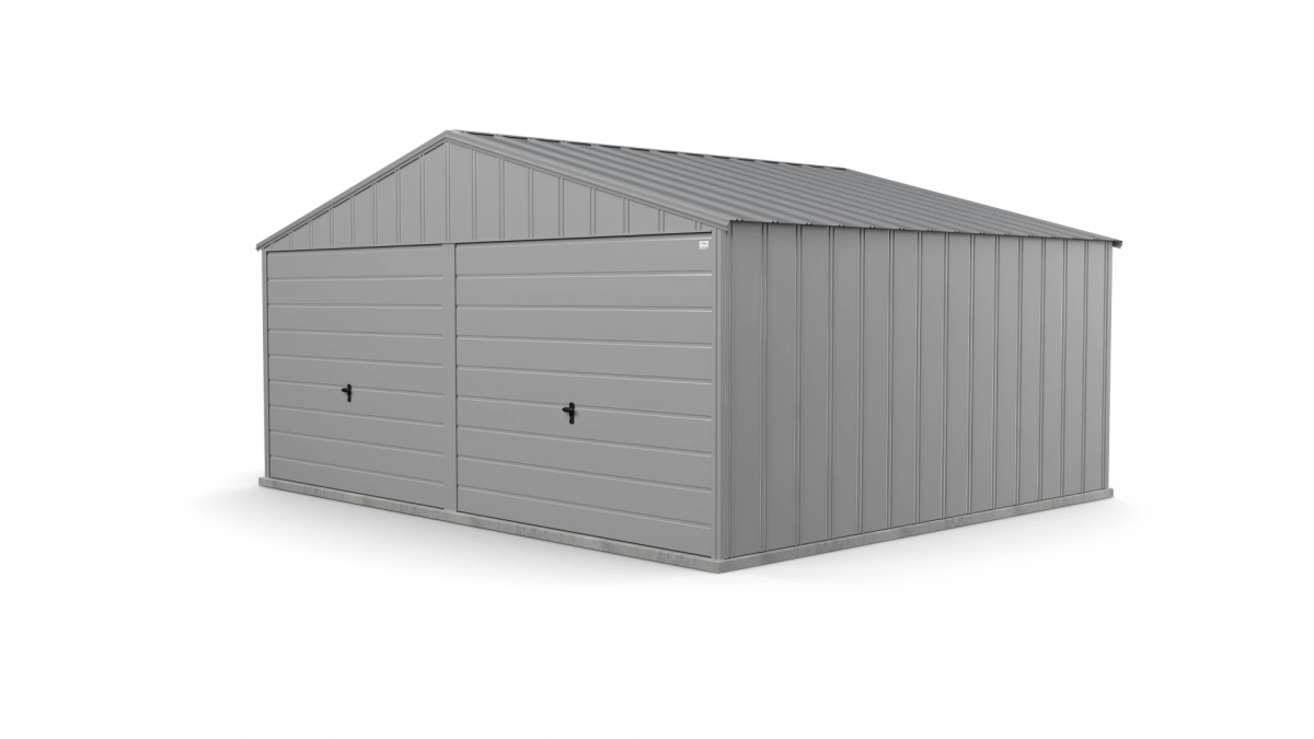 RETRO Blechgarage Duo-Falz, 6 m × 5 m, ausgestattet mit zwei Schwingtoren und Satteldach. Die Wand- und Dacheindeckung besteht aus Acryl Duo-Falzblech, während die Schwingtore aus Acryl-Trapezblech T-17 gefertigt sind.