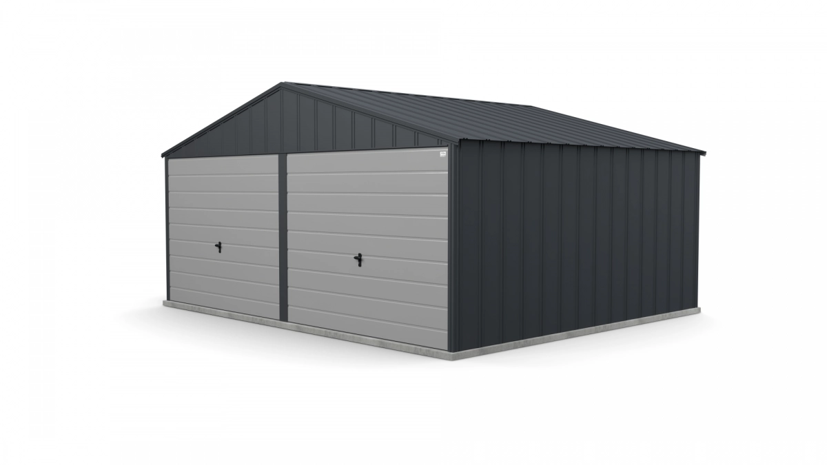 RETRO Blechgarage Duo-Falz, 6 m × 5 m, ausgestattet mit zwei Schwingtoren und Satteldach. Die Wand- und Dacheindeckung besteht aus Acryl Duo-Falzblech, während die Schwingtore aus Acryl-Trapezblech T-17 gefertigt sind.